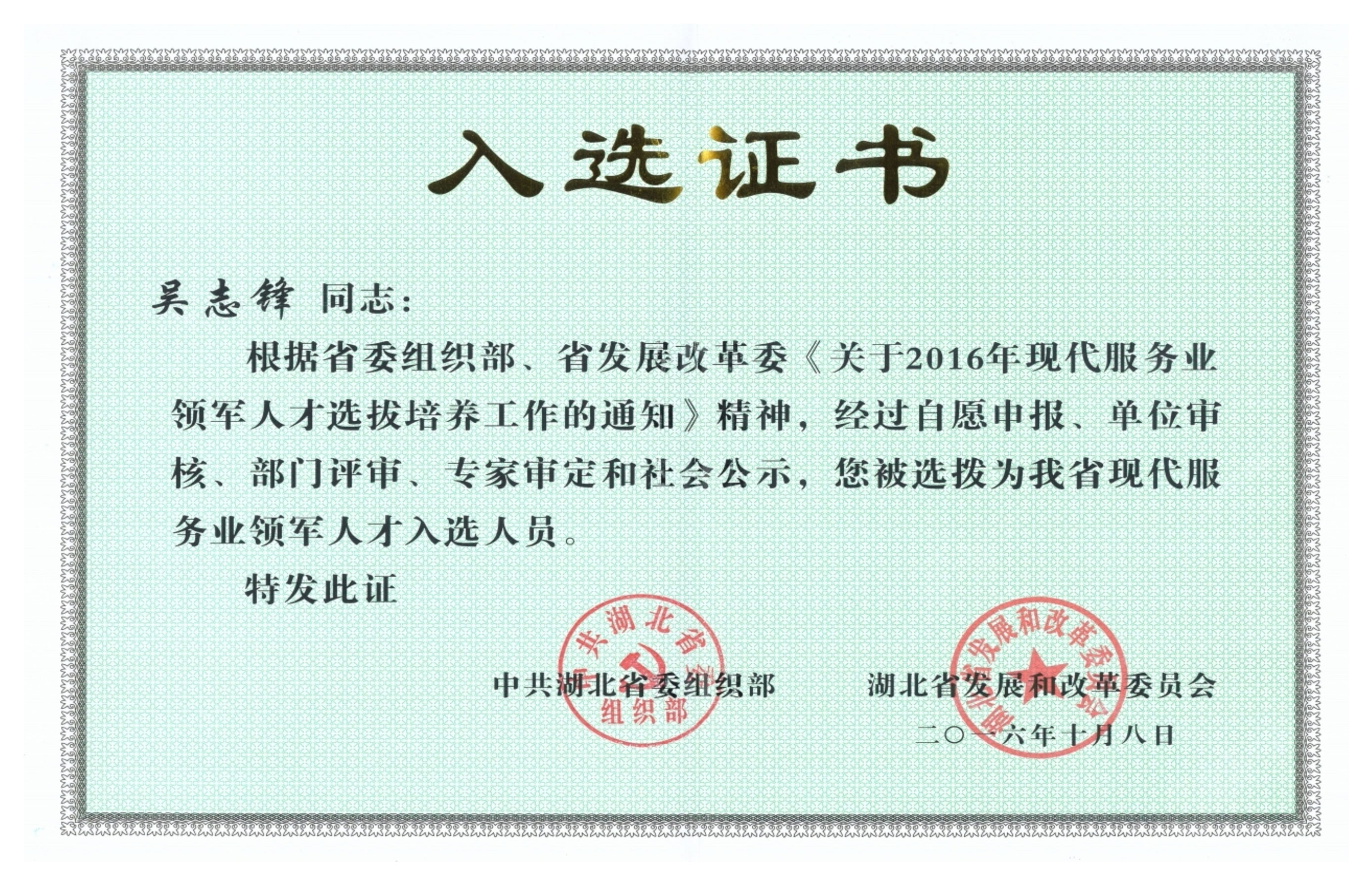 2016湖北省現(xiàn)代服務(wù)業(yè)領(lǐng)軍人才(吳志鋒)